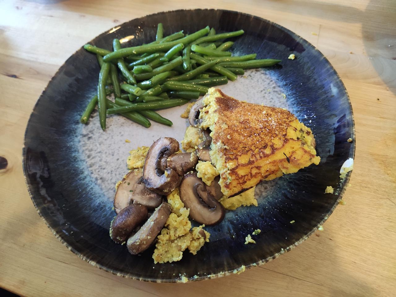 We didn’t manage to cut the omelet into parts without destroying its structure, and it was still a little bit too liquid on top. But it was still good.