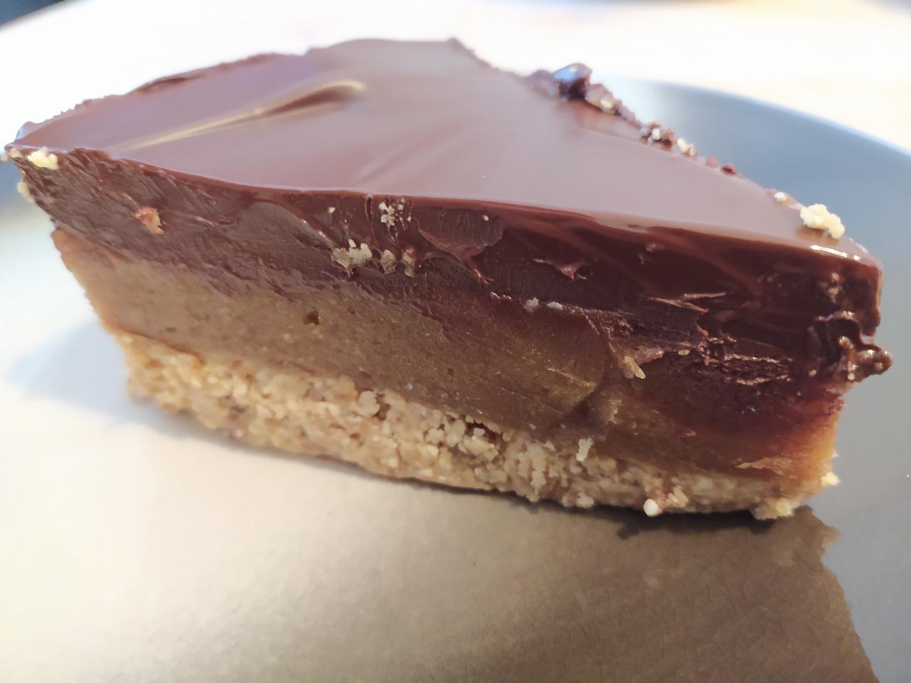 - Blend the rest of the dates (300g), the peanut butter, 120g of coconut oil and the water. You don’t have to wash the mixer/food processor. This should take quite a long time (around 10 minutes for me). It should have a proper caramel texture ; if it doesn’t then mix again (or add more water if it’s not mixing).